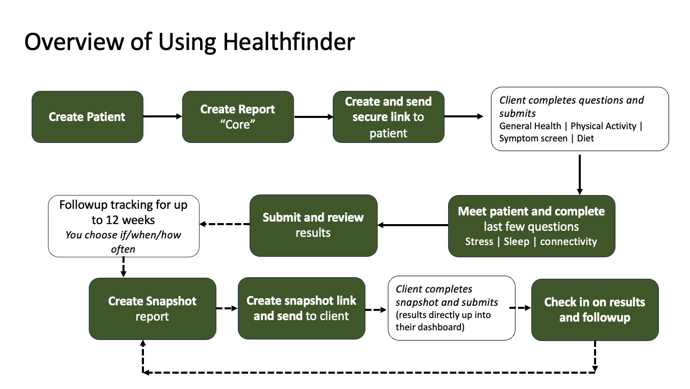 “Snapshot”: this is the tracking report that you can send to your clients as often as you like for up to 12 weeks after a Core Healthfinder has been completed. It gathers key health signals that you can track over time and see progress, use to check in with your patients. You cannot create a snapshot report unless a completed Healthfinder has been done in the last 12 weeks. It is up to you and your client if and how often you use the snapshots report. You do not get charged for snapshot reports.