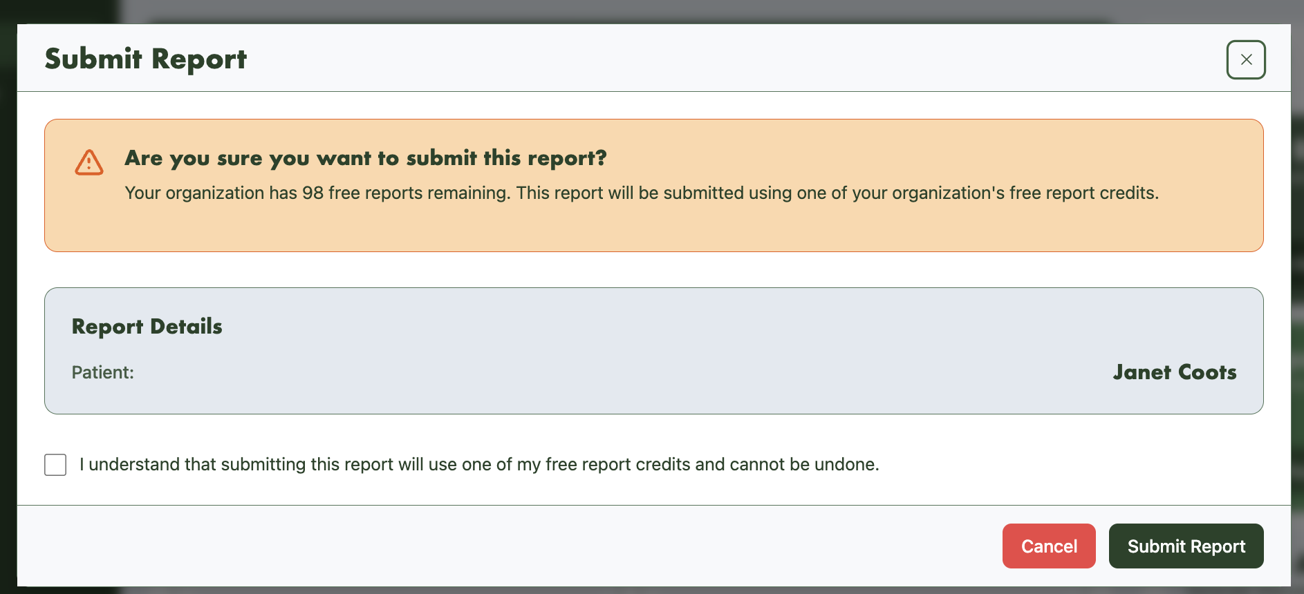 Once you have completed all sections, go “Back to Report Overview” and click Submit Report. the following pop up will show. This is important as this is where the charge is triggered. Once you are sure you want to submit and see results, check the box and click “Submit Report”